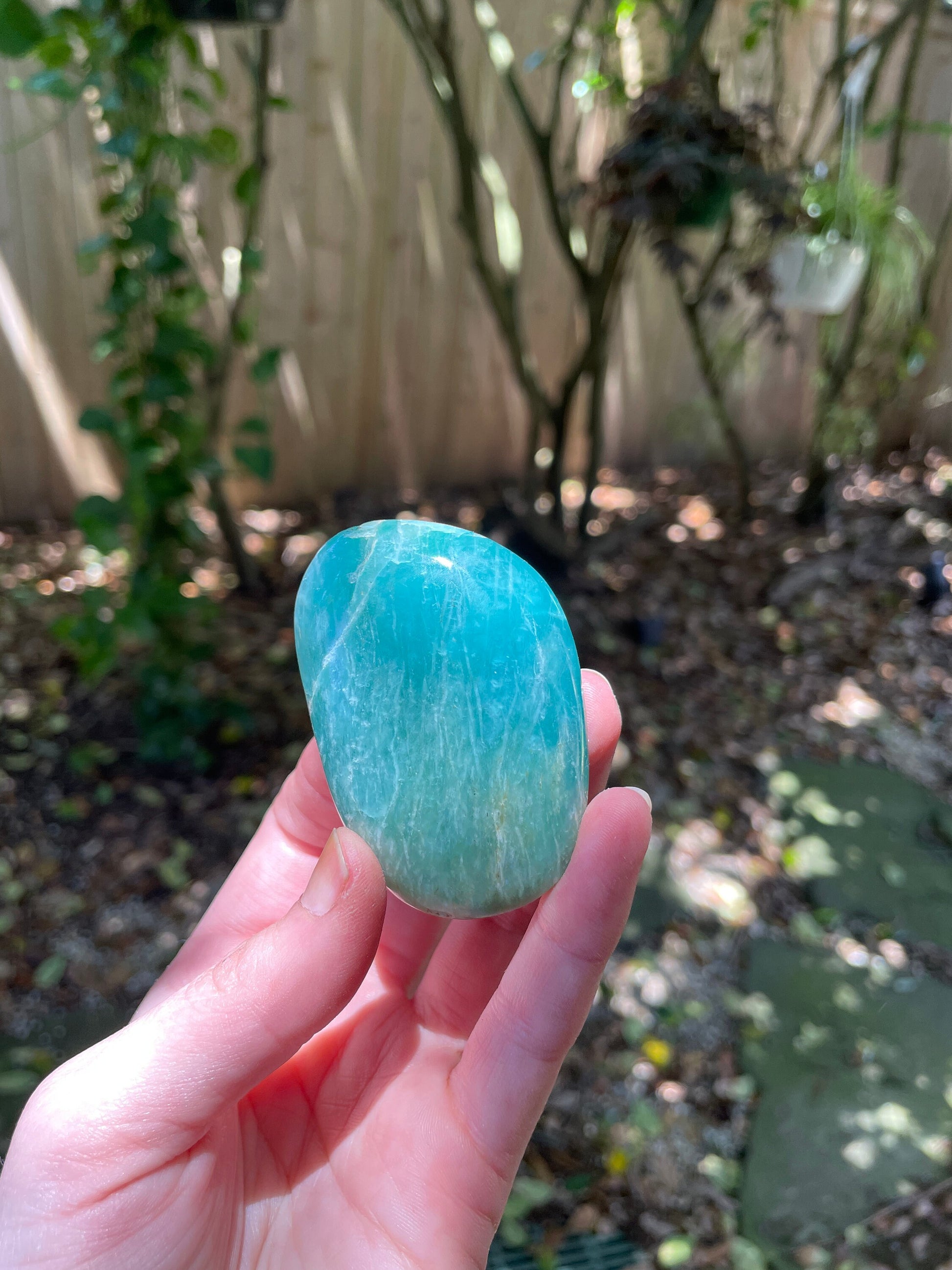 Beautiful blue calming Amazonite Palm Stone, lovely blend of blue green with white stations. Lovely little stone would make a great addition to any collection. 96.3g From Madagascar! Color changes depending on the lighting see pictures for detail.