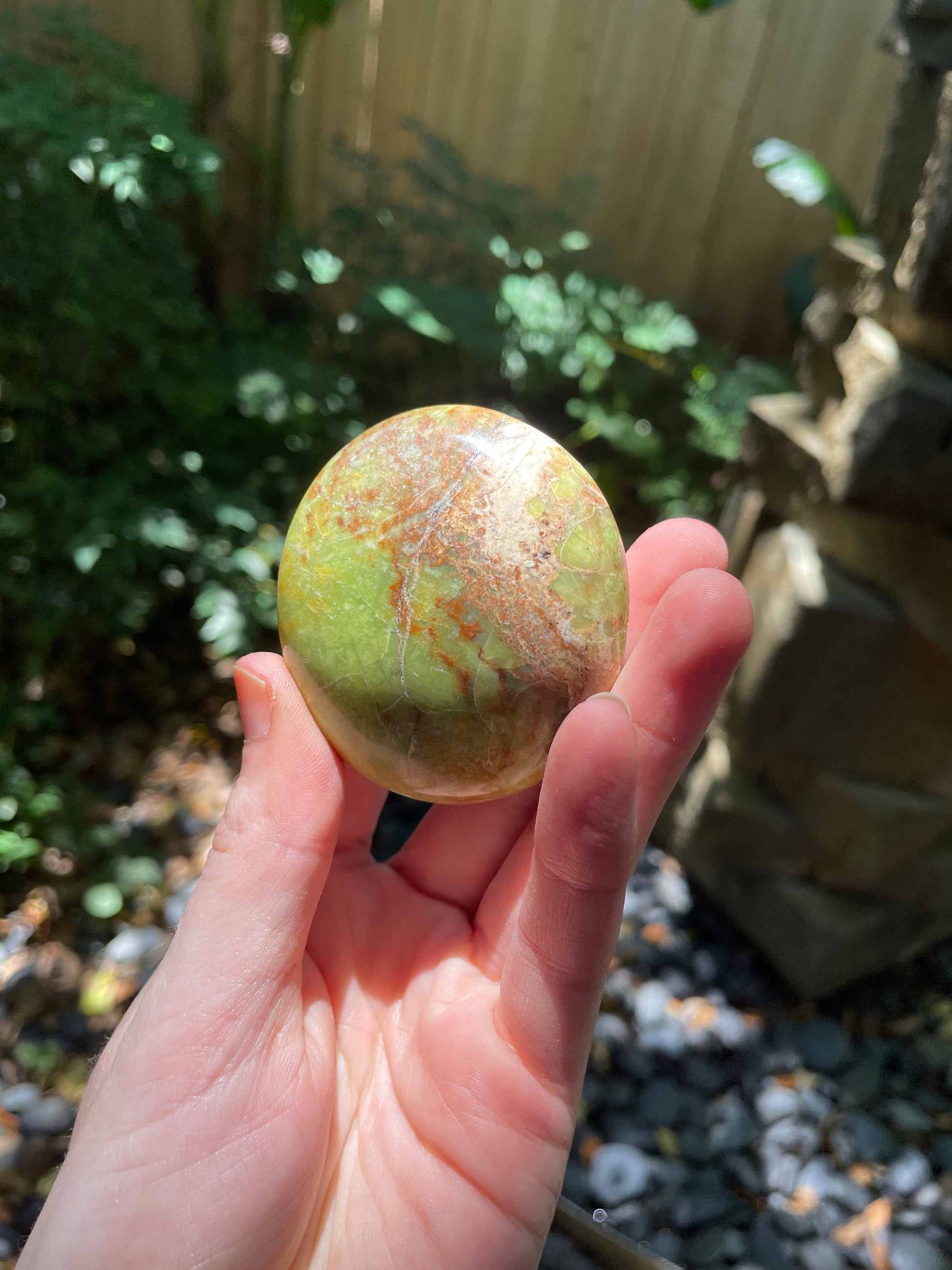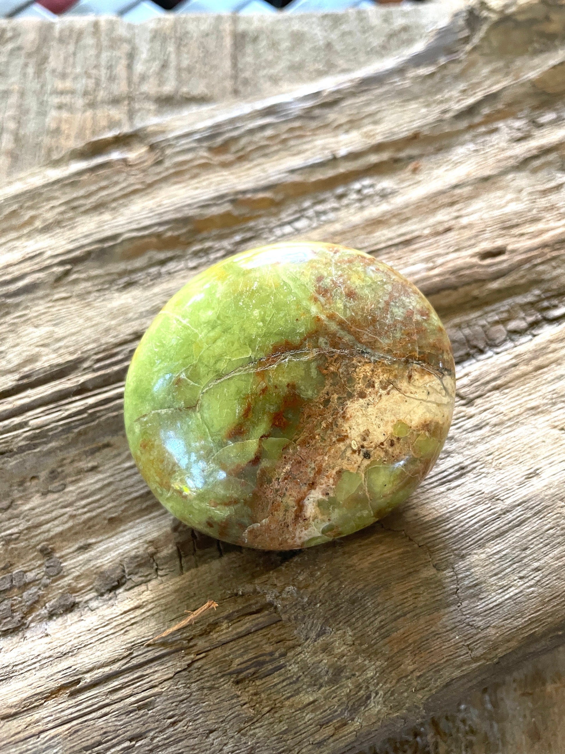 Beautiful green opal palm stone, from Madagascar. Beautiful green calming color, feels nice to the touch and has a nice weight for a palm stone. 86.4g